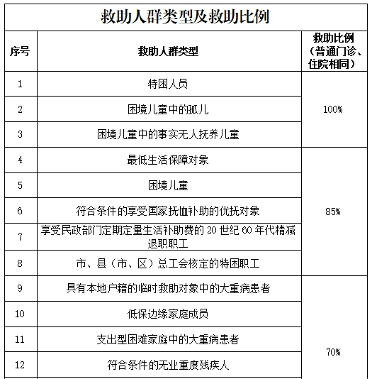 医疗救助对象根据认定的救助人群类型享受不同的救助比例,具体救助人群类型及救助比例见下表。