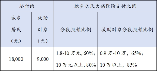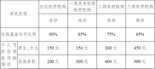 居民医保参保人员,对于起付标准以上,最高支付限额以下,符合基本医疗保险支付范围的费用,具体支付比例见下表。